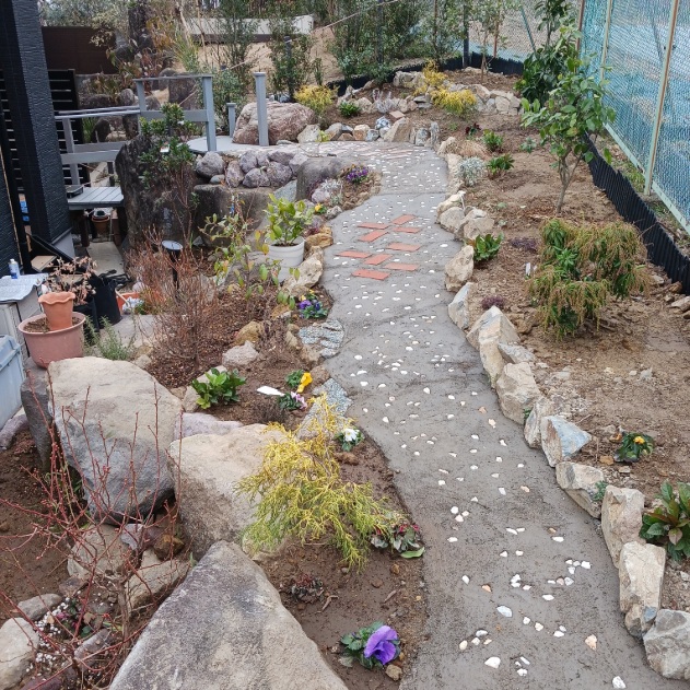 石の間に階段を架けたり、大きな石も動かしたりと大変な作業でしたが、楽しいお庭造りが出来たと職人も嬉しそうでした。
