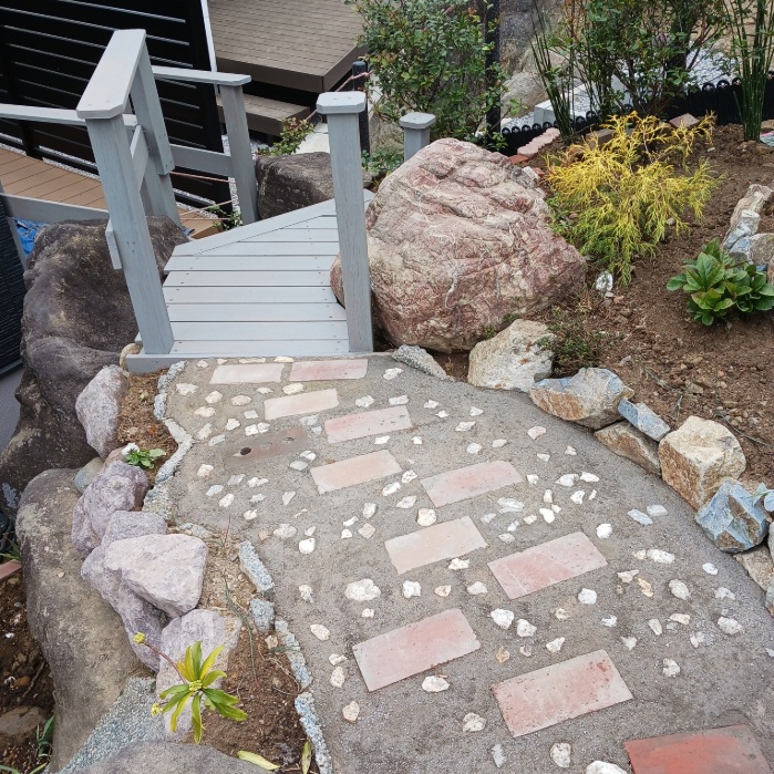 躯体から鉄骨で組み直し、表面はお家とバランスがとれるようにコンクリートにピンコロを敷き、自然に仕上げました。常時、耐荷重が必要な場所であるためしっかりと、でもコンクリートだけ無機質感は避けたいとのご希望でした。